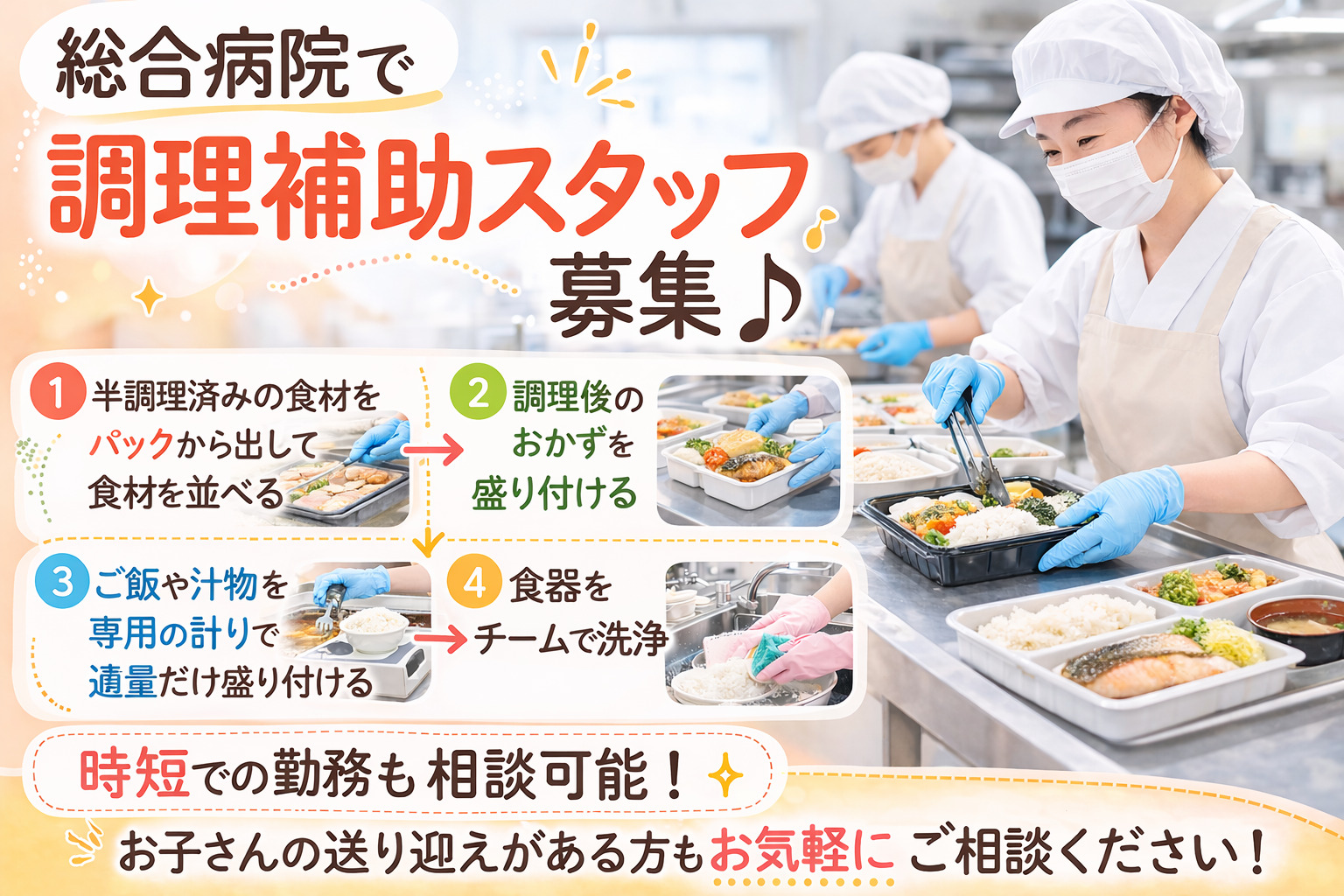 | 仕事内容 | 総合病院で調理補助スタッフ募集♪ 重たい物ほとんどなし! 男女ともに活躍できるお仕事です。 作業内容 1.半調理済みの食材を、パックから出して、 焼いたり蒸したりするために 鉄板へ並べて、調理師さんにお渡し♪ ↓ 2.調理が終わったおかずを お弁当パックや容器へ丁寧に盛り付けます◎ ↓ 3.ご飯や汁物を、専用の計りを使って 決まった量だけ盛り付けます★ 台車にセットすれば完了! ↓ 4.食べ終わった後の食器を チームで手分けして きれいに洗っていきます♪ 時短での勤務も相談可能、子供の送り迎えがあるから…・子供が学校の間だけ働きたいなどもお気軽にご相談ください! |