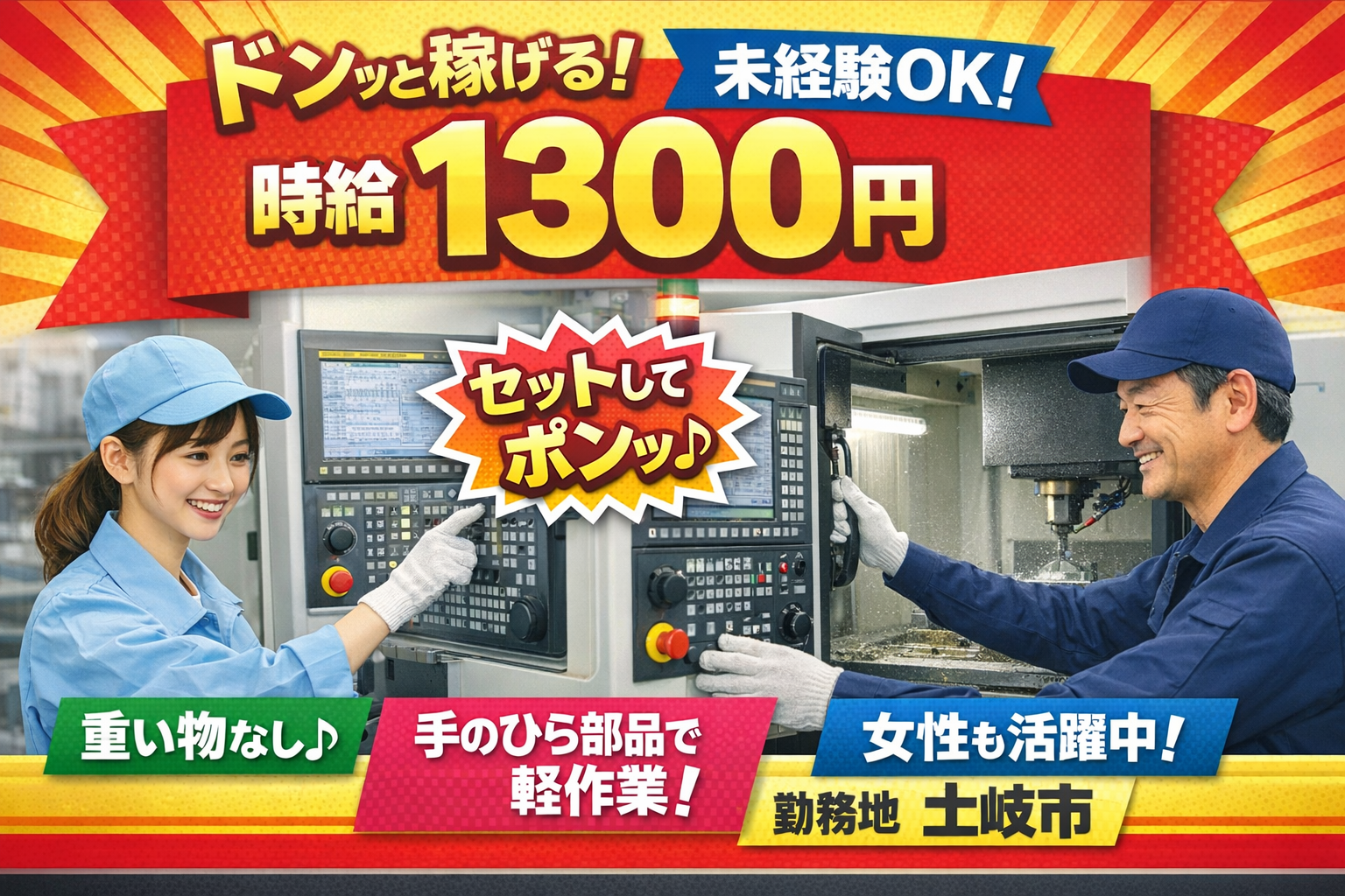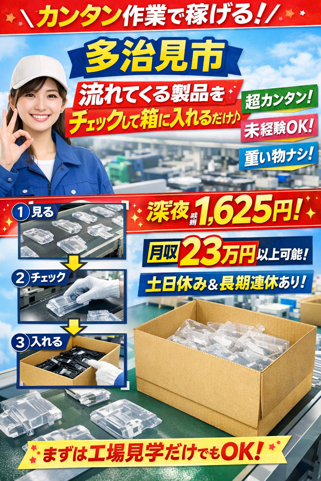 | 仕事内容 | \とにかくカンタン作業♪/ 流れてくるプラスチック製品を 見る→箱に入れるだけ! ★重い物なし ★冷暖房完備のキレイな工場 モクモク作業が好きな方にピッタリのお仕事です! 扱うのは軽いプラスチック製品。 油汚れなどもなく、キレイな工場でのお仕事です。 【作業内容】 (1)コンベアで製品が流れてくる ↓ (2)キズや欠けがないかチェック ↓ (3)問題なければ箱に入れる たったこれだけのシンプル作業! 難しい作業や重い物は一切ありません。 未経験の方でもすぐに覚えられるお仕事です。 【職場環境】 ・冷暖房完備 ・キレイな工場 ・軽いプラスチック製品 ・モクモク作業 ・未経験OK 20代~50代の男女活躍中 ※勤務地について 多治見市東町の工場での勤務となりますが、 ご応募いただいた方の お住まいの場所によっては 多治見市笠原町の新工場をご案内する場合もございます。 通勤しやすい勤務地をご相談ください。 【最後の一言】 「難しい仕事は不安…」 そんな方でも安心の カンタン軽作業です。 少しでも気になったら まずは工場見学だけでもOK! お気軽にご応募ください。 |