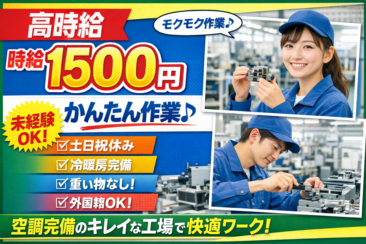 | 仕事内容 | ■仕事内容 工作機械を製造している工場での ★★かんたん軽作業★★(組付け)のお仕事です♪ 【作業の流れ】 1.必要な部品を準備 2.決められた場所に部品を取り付け 3.チェックして完了 → たったこれだけのシンプル作業! ・細かい作業なし ・重たい物なし ・すぐに覚えられるカンタン作業! ■アピールポイント ・時給1500円の高時給!しっかり稼げる♪ ・土日祝休み+大型連休あり(プライベート充実) ・冷暖房完備のキレイな工場で快適勤務♪ ・重量物なし!体への負担少なめ◎ ・1人でモクモク作業が好きな方にピッタリ! ・10代~40代の男女活躍中! ・未経験スタート多数活躍中♪ ・外国籍の方も活躍中! |
